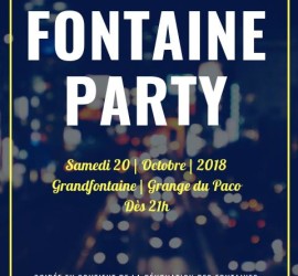 Jeunesse l’Etoile présente « Fontaine Party » Rendez-vous le samedi 20 octobre 2018 dès 21h00 à la « Grange du Paco ». Durant la soirée, DJ Oxfire sera là pour vous ambiancer. Soirée en soutient du projet de la rénovation des fontaines du village.